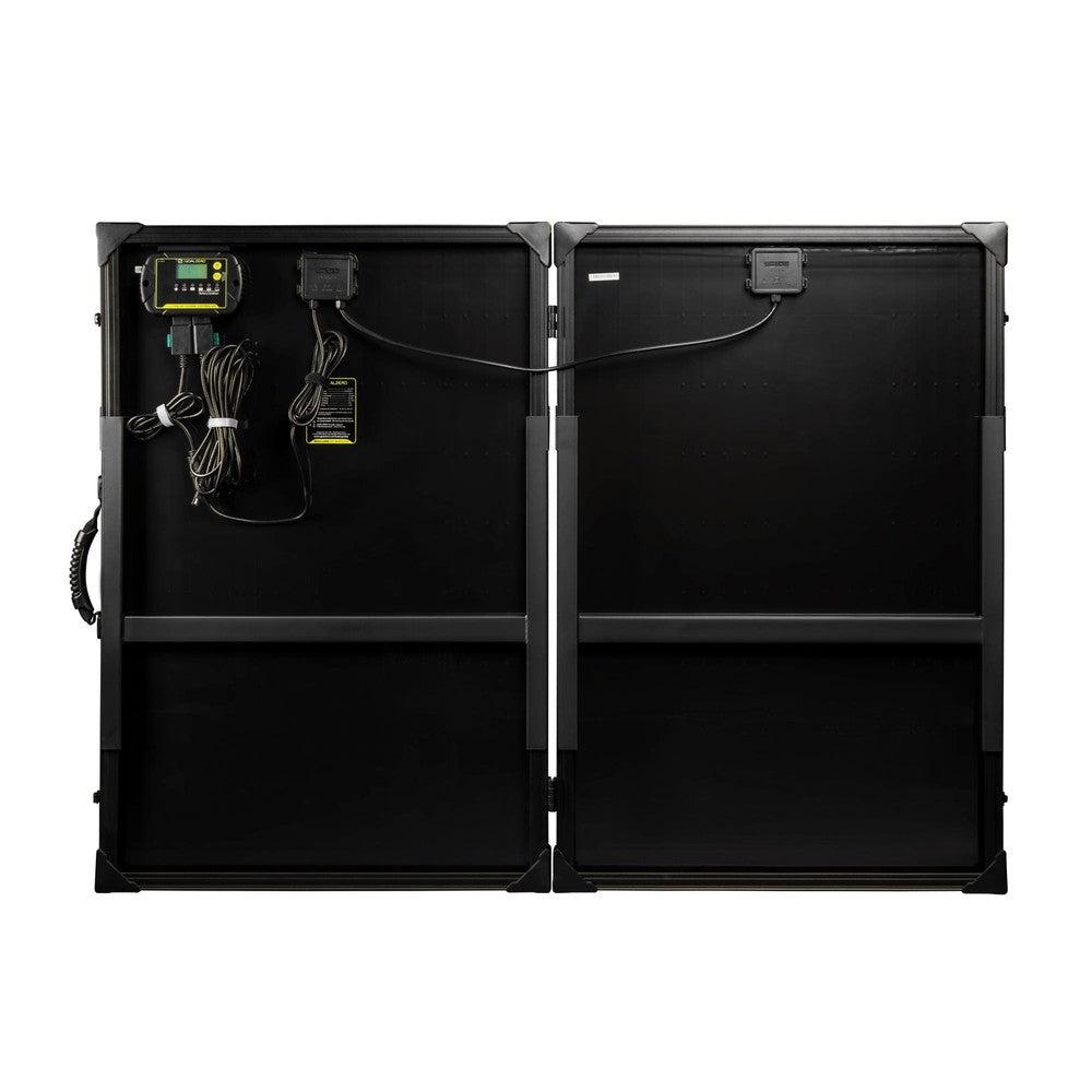 This powerful, portable kit features a hinged 200-Watt panel and 20-Amp Charge Controller to speed up charge times of 12V batteries. Includes a canvas carrying bag and integrated kickstand for easy transport and setup.